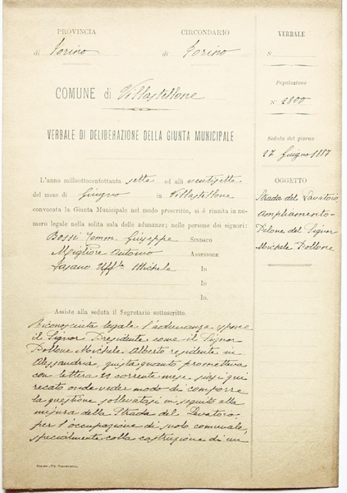 Presso l’archivio comunale di Villastellone sono conservati l’archivio storico comunale (1507-1999) e altri importanti archivi: Scuola materna “Principessa di Piemonte” (1871-1979), Opera Nazionale per la Protezione della Maternità e Infanzia (1931-1978), Opera Nazionale Balilla (1937), Opera Generale dei tagli (1765-1853), Consorzio Strada Pellabue (1955-1959), Tribunale di Villastellone (1752-1881), Giudice Conciliatore (1886-1941). In archivio sono anche presenti una parte del fondo appartenente all’Opera Pia Regio Albergo Santa Croce (1873-1962) e i fondi dell’Ente Comunale di Assistenza e della Congregazione di Carità, che però non sono ancora inventariati.